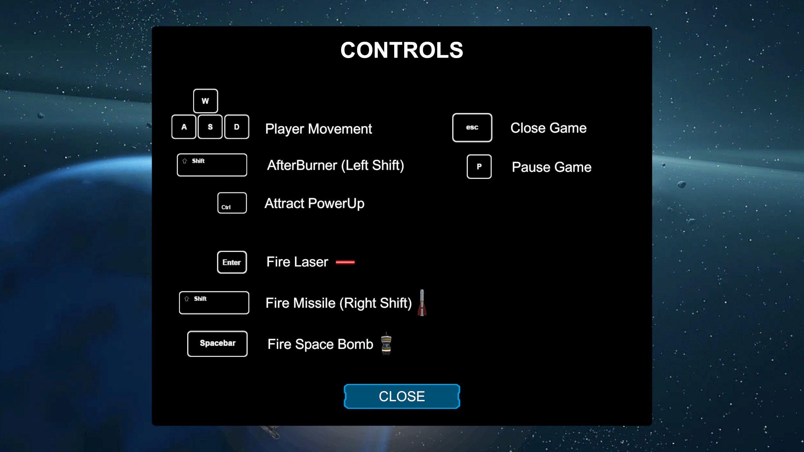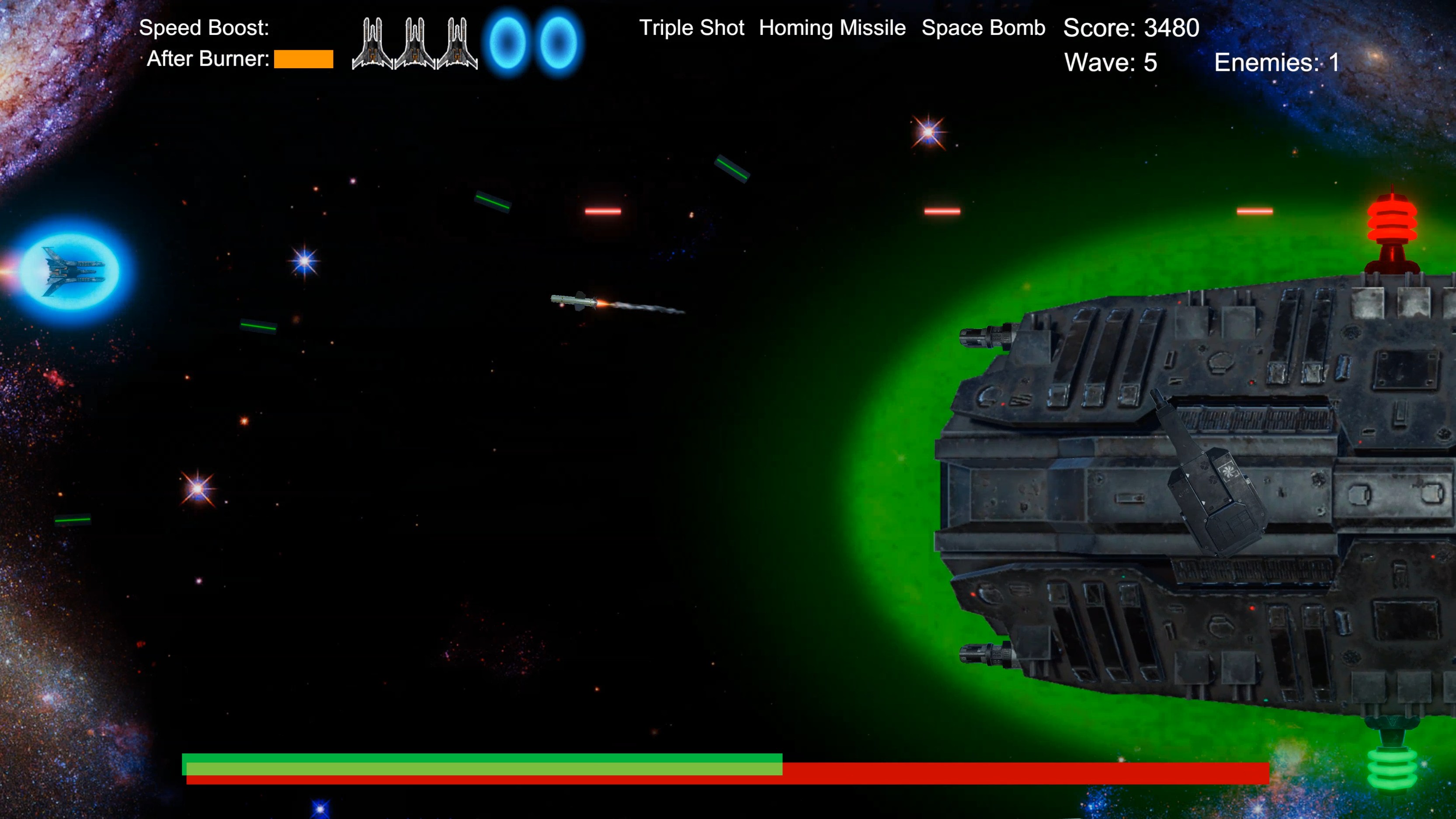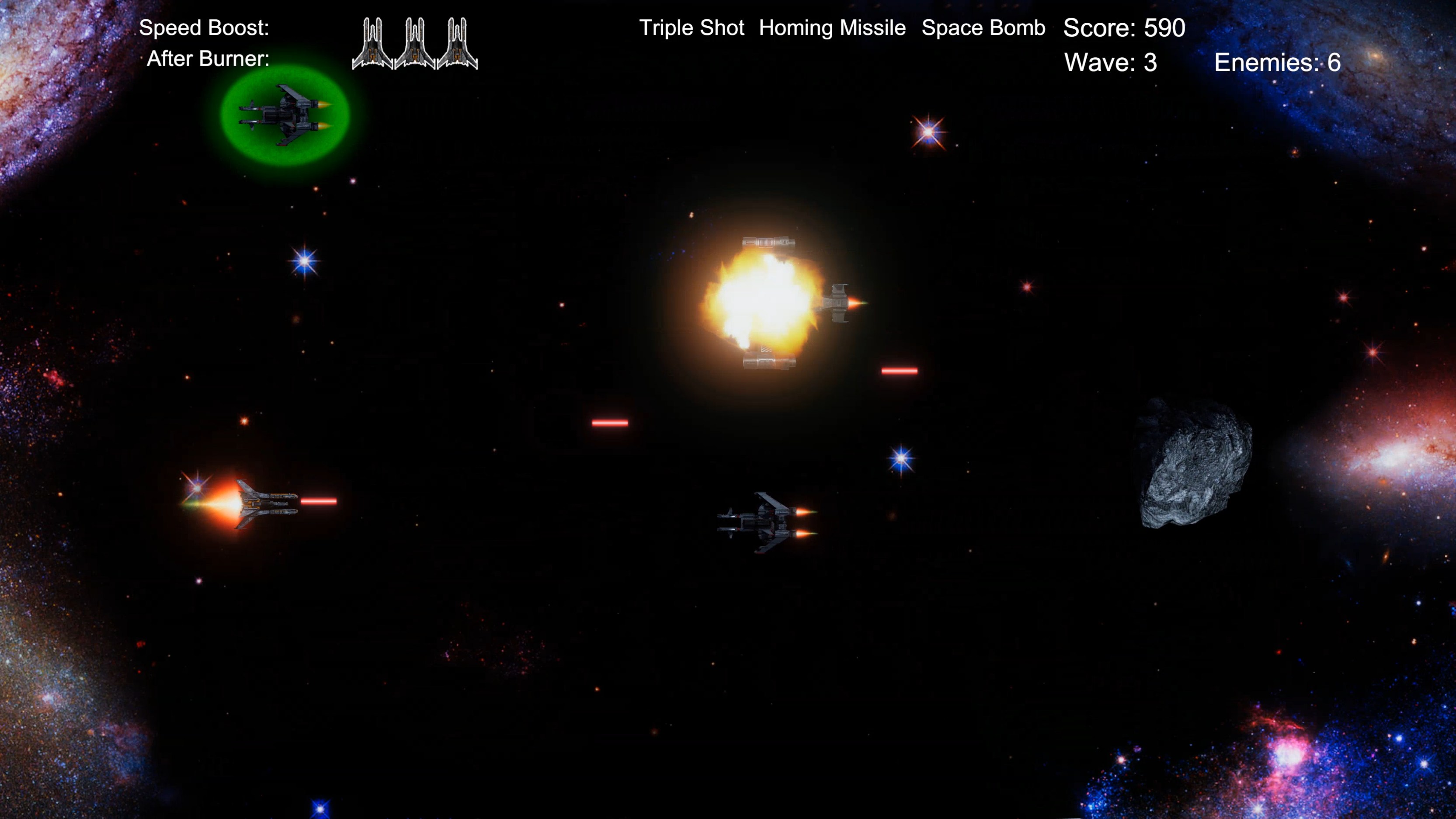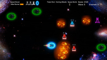 A horizontal space shooter arcade! Pew pew enemies! Collect Power-Ups! Shields! Missiles! Space Bombs! Can you survive all 5 waves and defeat the Boss?!