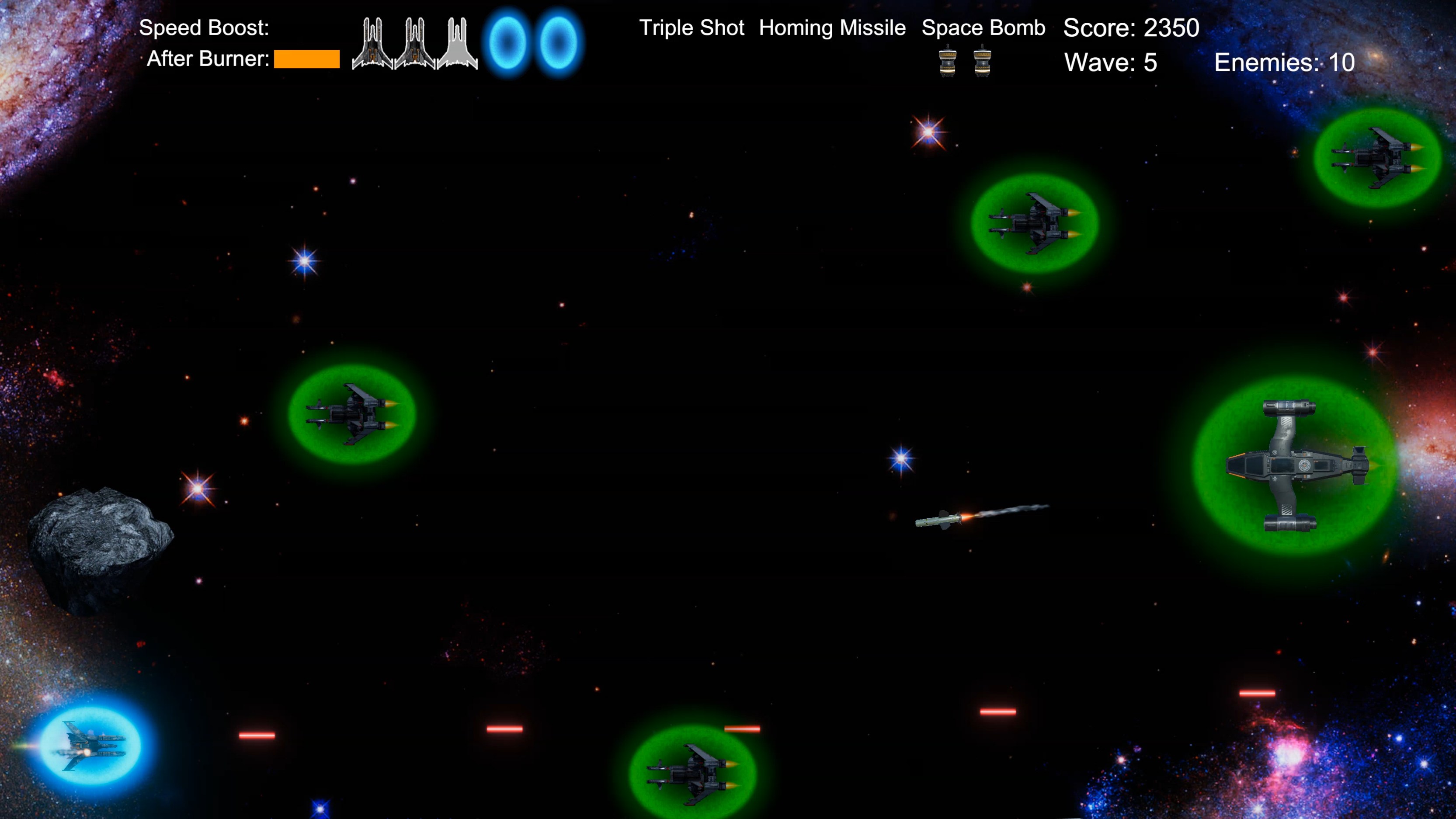 A horizontal space shooter arcade! For PC! Pew pew enemies! Collect Power-Ups! Shields! Missiles! Space Bombs! Can you survive all 5 waves and defeat the Boss?!